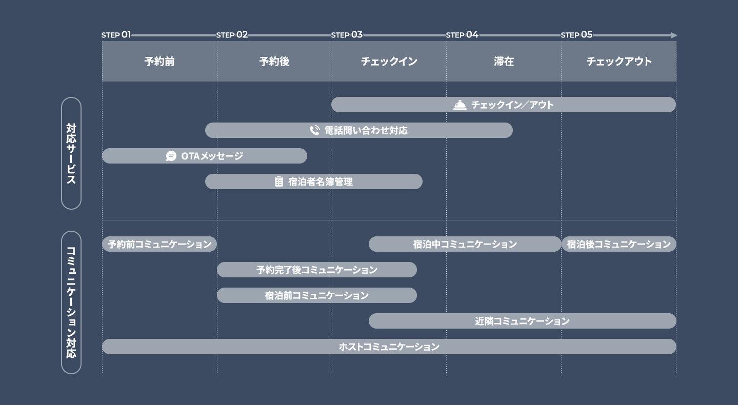 インバウンド増加により競争が激化している民泊業界。 OTAサイトでの価格、場所、室内写真以外での差別化が難しいのが民泊運営事業者の課題となっています。 最高な口コミ、評価を得るには宿泊先選定段階での、ツーリストへの宿泊体験イメージを持たせる為のスピーディなコミュニケーションと困り事にいつでも対応できるという安心感です。